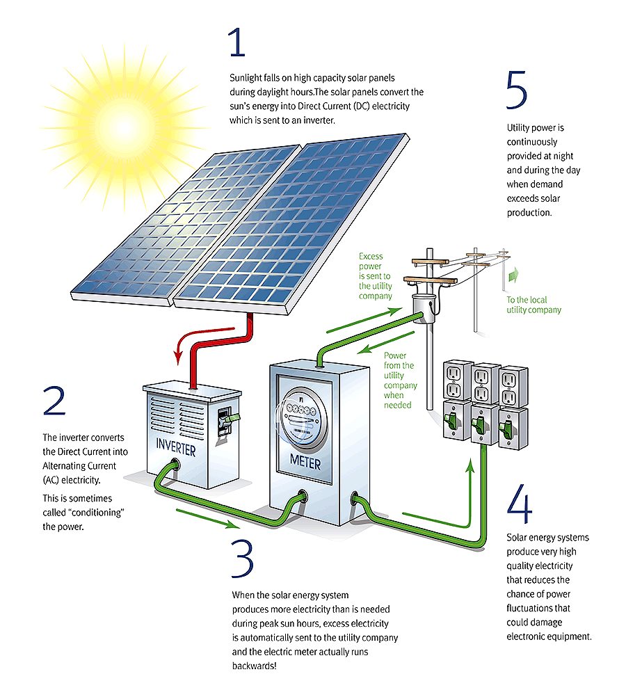 An inverter conditions the power and converts it to AC electricity for use in your home